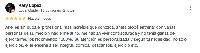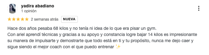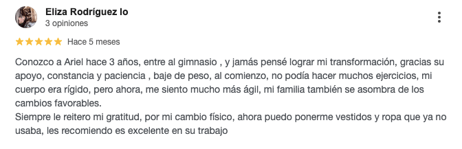 Ariel se adapta a tus necesidades, por lo tanto, te ofrece una variedad de modalidades de entrenamiento para que no haya excusas. Ariel te ofrece entrenamiento en línea, entrenamiento presencial, grupal, específico de glúteos y específico de tercera edad. Esto permite a sus clientes tener la confianza en un entrenamiento estructurado que realmente permita ver resultados en los primeros 3 meses.